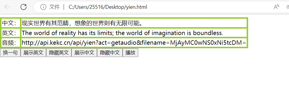 <input type="button" value="换一句" onclick="Ajax_start()"><input type="button" value="展示英文" onclick="zhanshien()"><input type="button" value="隐藏英文" onclick="yincangen()"><input type="button" value="展示中文" onclick="zhanshicn()"><input type="button" value="隐藏中文" onclick="yincangcn()"><input type="button" onclick="autoPlay()" value="播放" />