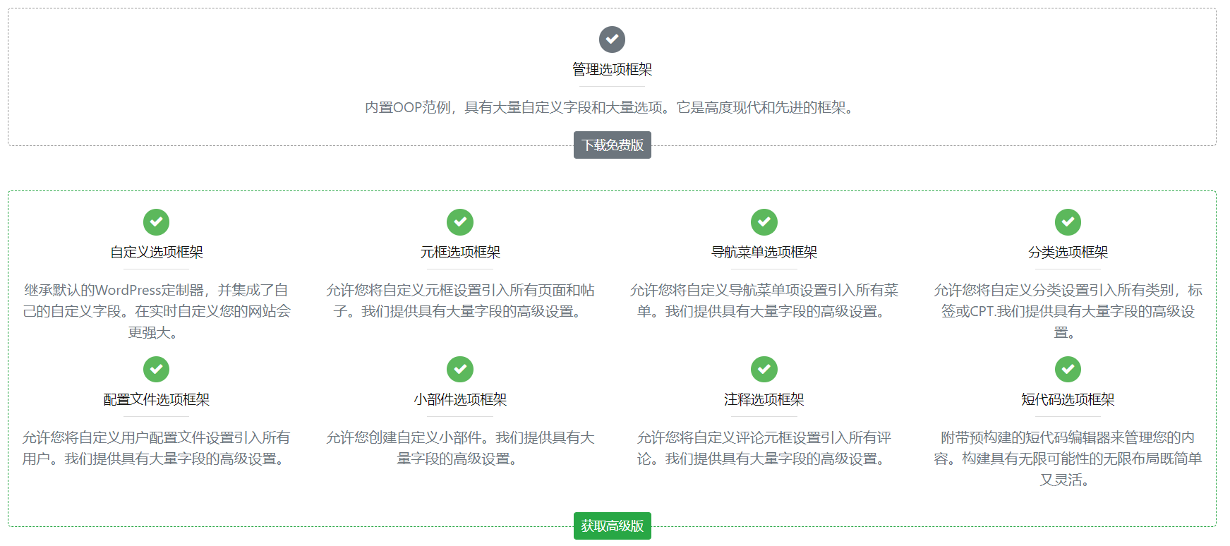 很多国内主题也采用这个框架来开发,比如子比主题。免费版可以添加后台管理设置,高级版可以做的东西很多,收费版下载地址及介绍:https://www.hmmoo.com/wordpress/wordpressplugins/103.html