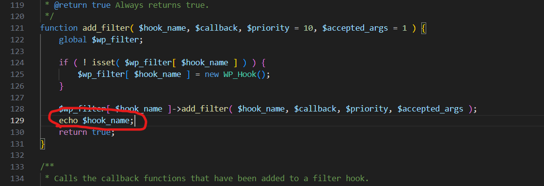 上面说到,action和liter底层相同,最终,我们的add_action是通过add_filter实现的,所以我们只需要修改add_filter源码即可,最终,我是在“/wp-includes/plugin.php”查询到源码,注意如下129行,就是我添加的,不严谨,应该是要不显示,重定向存储到其他地方才好,这样有的地方会报错吧,不过不影响我们分析。