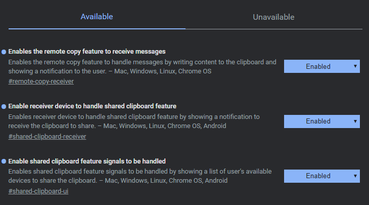 使用搜索框查找“剪贴板”(clipboard)。应该会弹出三个标志:“使接收器设备能够处理共享剪贴板功能”(Enable receiver device to handle shared clipboard feature),“使共享剪贴板功能信号能够被处理”(Enable shared clipboard feature signals to be handled)和“同步剪贴板服务”(Sync clipboard services);